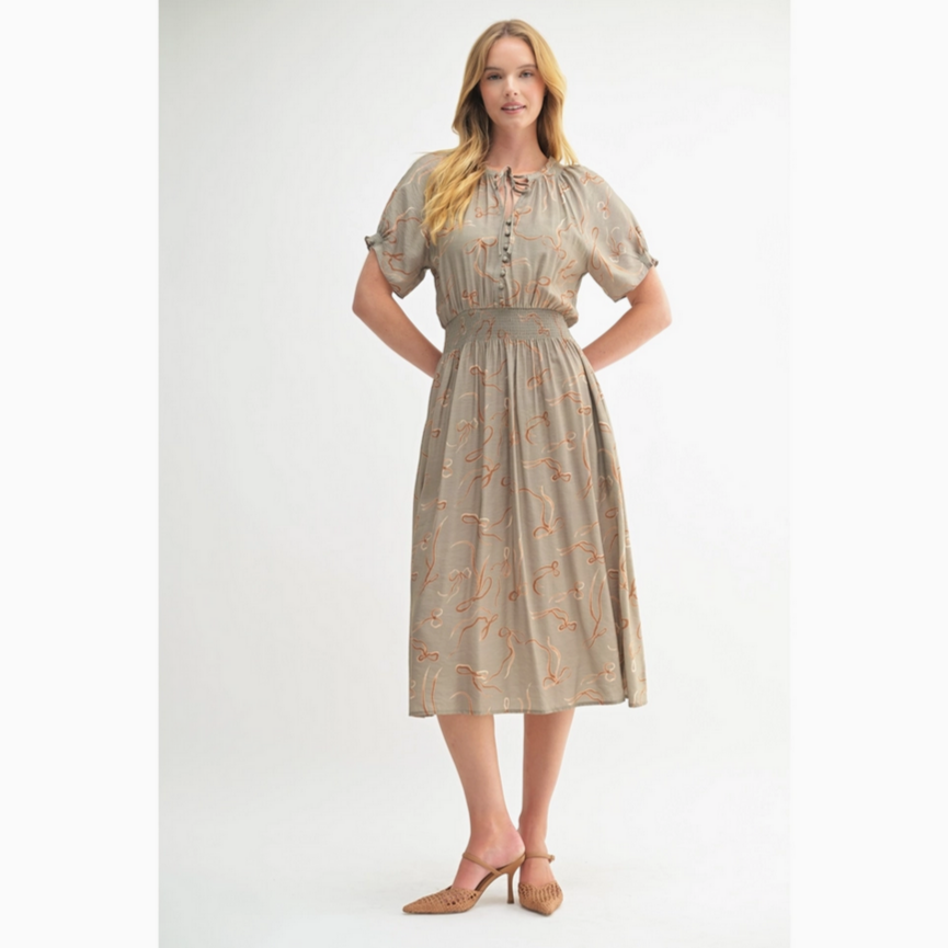 Effortlessly elegant with a touch of charm, the Bow Print Button Front Midi Dress from Fun2Fun is a standout piece that still feels easy and wearable. Designed in a soft sage-taupe tone with a delicate tonal bow print, this dress brings subtle interest while keeping a refined, understated look.