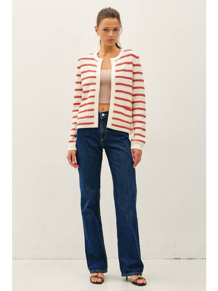 Create an accountAn easy layering piece with timeless appeal, the Chunky Knit Striped Open Cardigan from Be Cool brings texture, warmth, and effortless style to your everyday wardrobe. Designed in a soft ivory knit with bold red stripes, this open-front cardigan has a relaxed silhouette that feels both cozy and polished. The chunky cotton-blend knit adds structure without heaviness, making it perfect for transitional seasons.