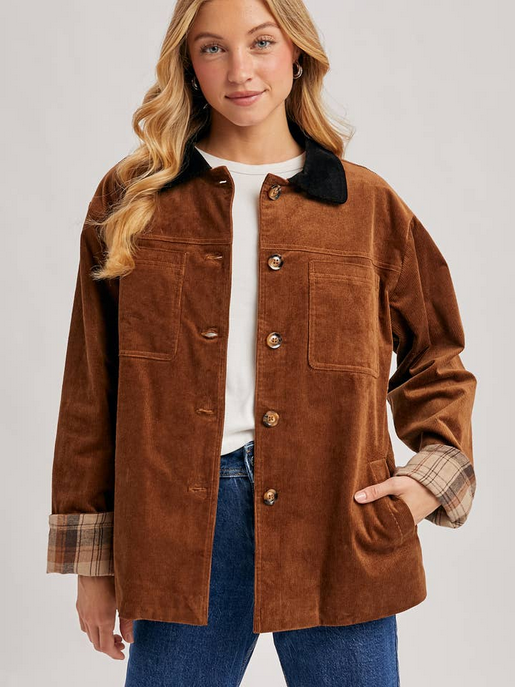 Create an accountLayer up in timeless style with the Bluivy Corduroy Barn Coat. This rugged-yet-refined outerwear piece is crafted from soft, durable corduroy with a hint of stretch for comfort. Featuring a relaxed silhouette, functional front patch pockets, a button-down front, and contrast plaid cuffs, it’s designed to take you from crisp autumn mornings to cozy winter afternoons. The contrasting black corduroy collar adds a classic touch, while the flannel lining peeks out just enough to feel like an elevated nod to traditional workwear. Whether you’re headed to the farmer’s market or just want a cozy top layer, this jacket blends utility and style effortlessly.