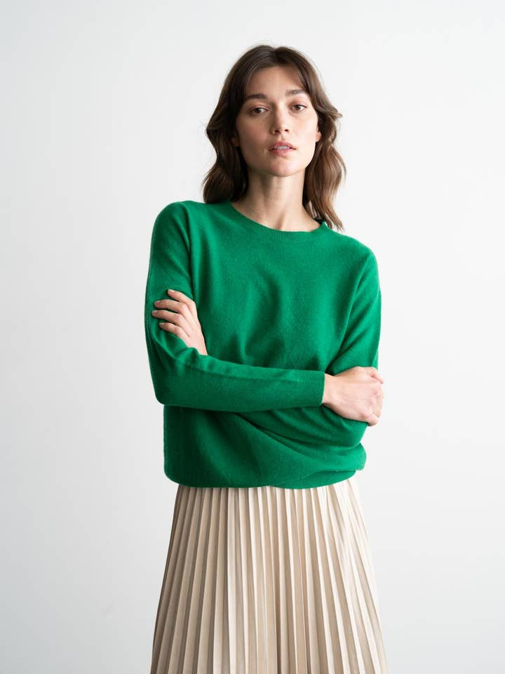 Create an accountSoft, timeless, and endlessly versatile — this classic crew neck sweater from Elle Grey is the effortless staple your fall-to-spring wardrobe craves. Crafted in a beautifully balanced knit, it offers a streamlined fit that layers easily or stands on its own. The rich green hue adds a pop of personality to a neutral palette, while the ribbed cuffs and hem deliver subtle structure. Whether paired with tailored trousers, denim, or a pleated skirt, this is the kind of foundational knit you’ll wear on repeat.