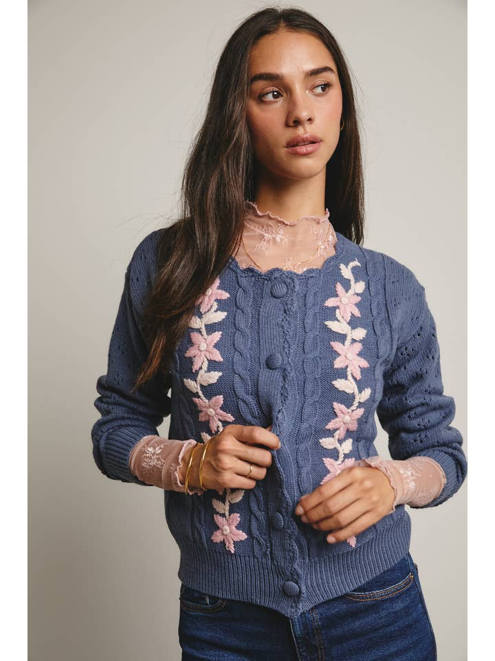 Romantic and cozy, this Floral Embroidered Knit Cardigan by Forte is the perfect layering piece for a vintage-inspired fall or winter look. Featuring delicate cable-knit detailing and sweet floral embroidery in soft pink tones, this cardigan delivers a playful feminine charm while remaining comfortably casual. The tone-on-tone covered buttons, crew neckline, and ribbed trim offer timeless structure with a whimsical twist. Made from 100% acrylic for easy wear and care, it’s ideal over everything from high-rise denim to flowy skirts.