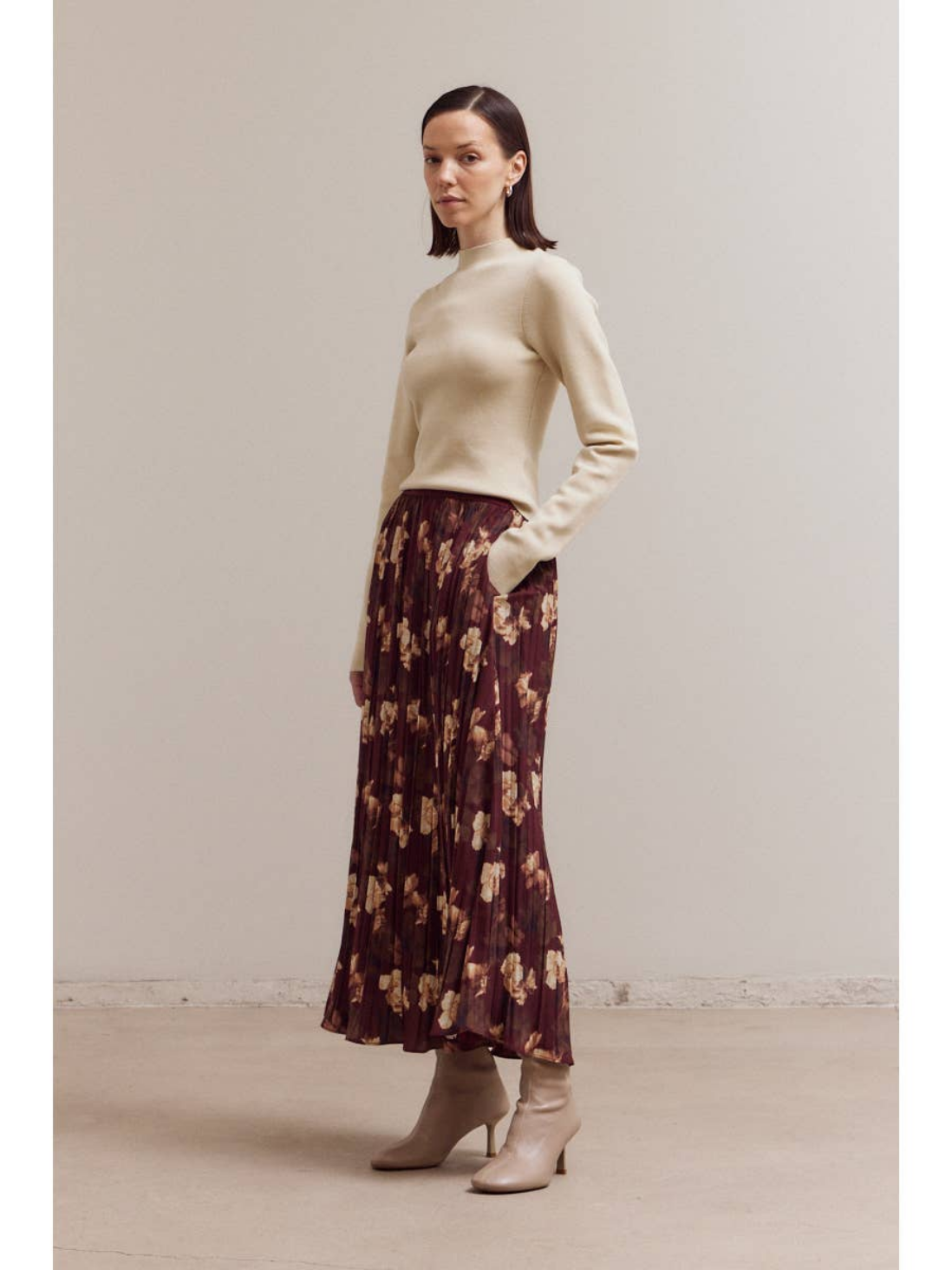 Create an accountElevate your fall wardrobe with the effortless elegance of the Floral Print Pleated Midi Skirt by Grade and Gather. Crafted from lightweight, flowy polyester, this skirt features soft pleats and a rich wine base adorned with a romantic floral print in warm neutral tones. The mid-length silhouette adds movement and femininity, while the elastic waistband ensures a comfortable fit. Pair it with a fitted sweater and ankle boots for a polished yet relaxed look that's perfect for brunch, work, or seasonal gatherings.