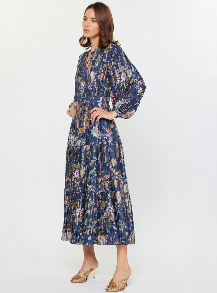 This Current Air Floral Printed Pleated Long Dress is a standout piece designed to flow with you. Featuring a richly hued navy base and a vibrant floral print, this dress is pleated throughout for elegant movement. The split neckline and tiered midi silhouette create a flattering shape, while the sheer long sleeves add a touch of refinement. Ideal for weddings, garden parties, or when you simply want to feel effortlessly beautiful.