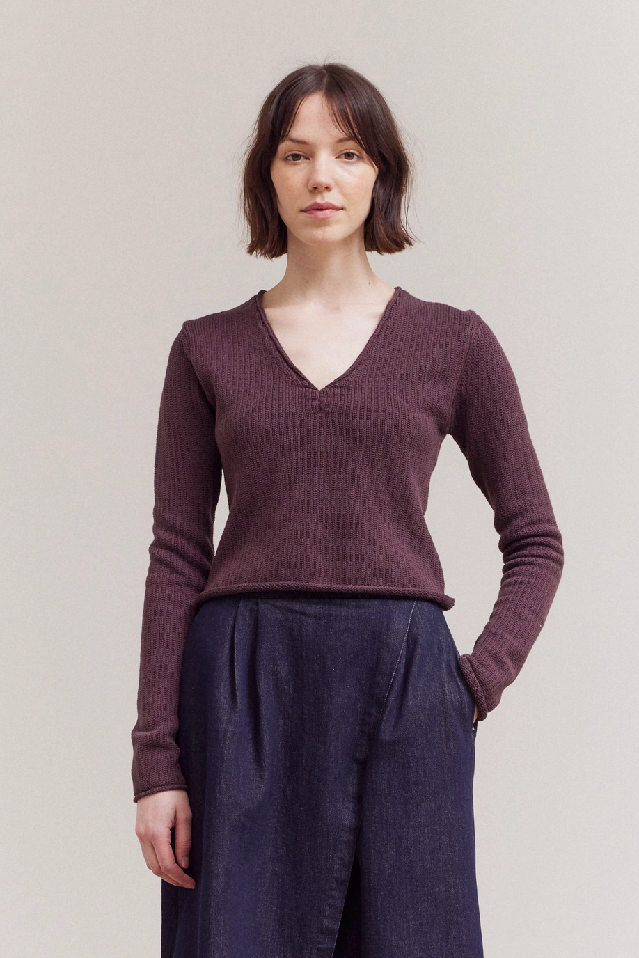 Add a touch of effortless texture to your everyday wardrobe with this beautifully crafted Front Knotted V-Neck Top from Grade & Gather. Made from a soft cotton-acrylic blend, this lightweight sweater features a subtle waffle knit and a deep aubergine hue that flatters all skin tones. The flattering V-neckline is finished with delicate raw-edge detailing, and the front is thoughtfully shaped with a gentle knotted drape that offers a relaxed yet refined silhouette. Style it with your favorite wide-leg denim or layer it under a tailored blazer for a casual-chic ensemble.