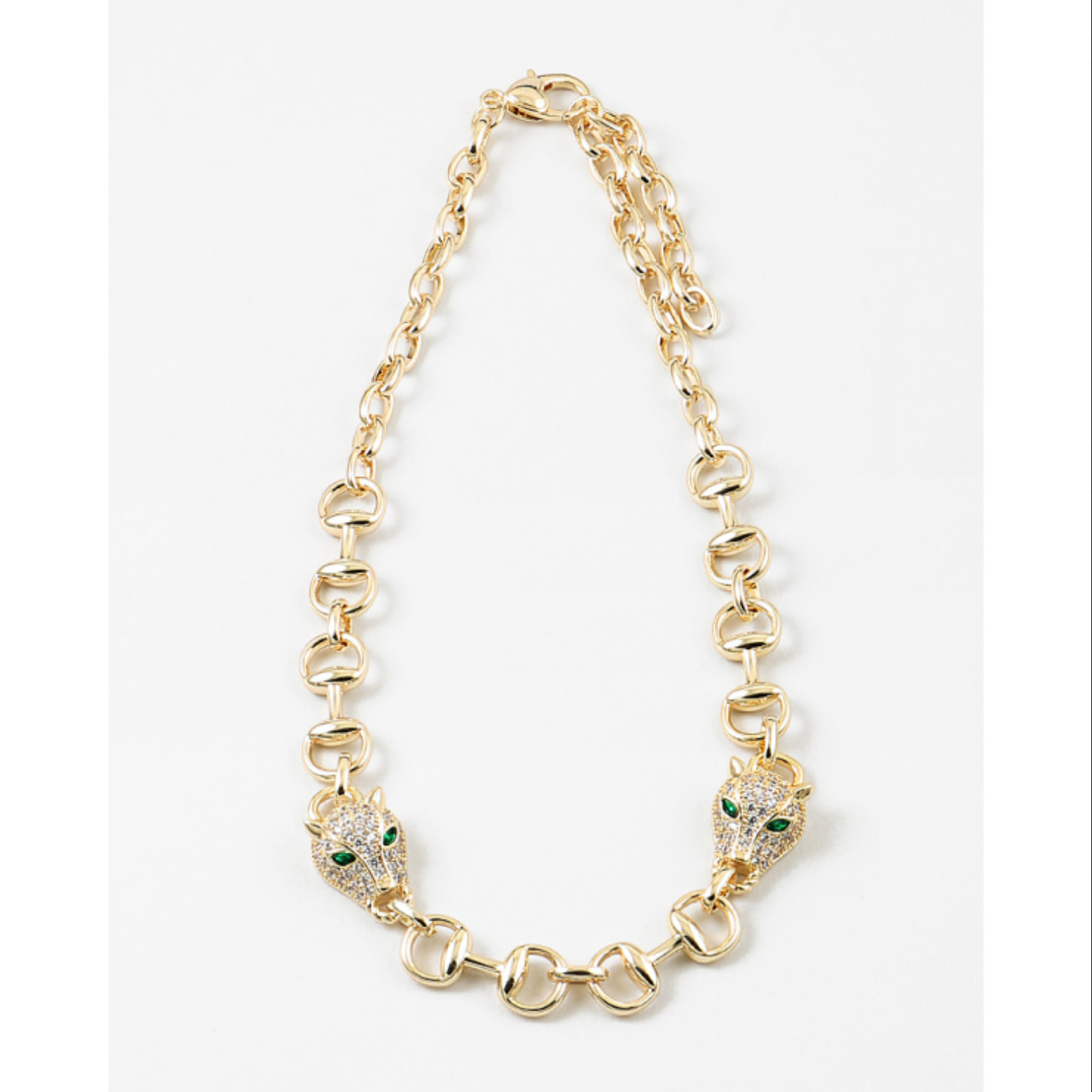 Make a bold statement with this fierce and fashion-forward Panther Chain Necklace from Blue Suede Jewels. Featuring chunky, high-shine gold-tone links and two intricately detailed panther heads encrusted with pave rhinestones and emerald-green eyes, this necklace is a showstopper. It’s the perfect mix of glam and edge—pair it with anything from a white tee to an evening dress for a look that roars with confidence.