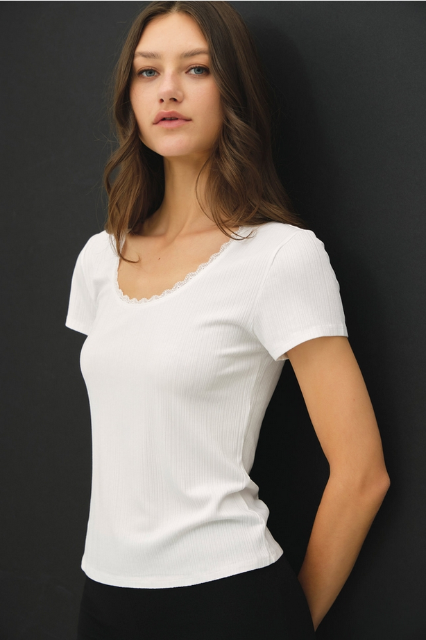 The ribbed knit fabric offers a flattering, body-skimming fit, while the scoop neckline with lace trim brings a subtle, romantic detail that feels effortless—not overdone. Lightweight and comfortable with a hint of stretch, it’s ideal for layering or wearing on its own.