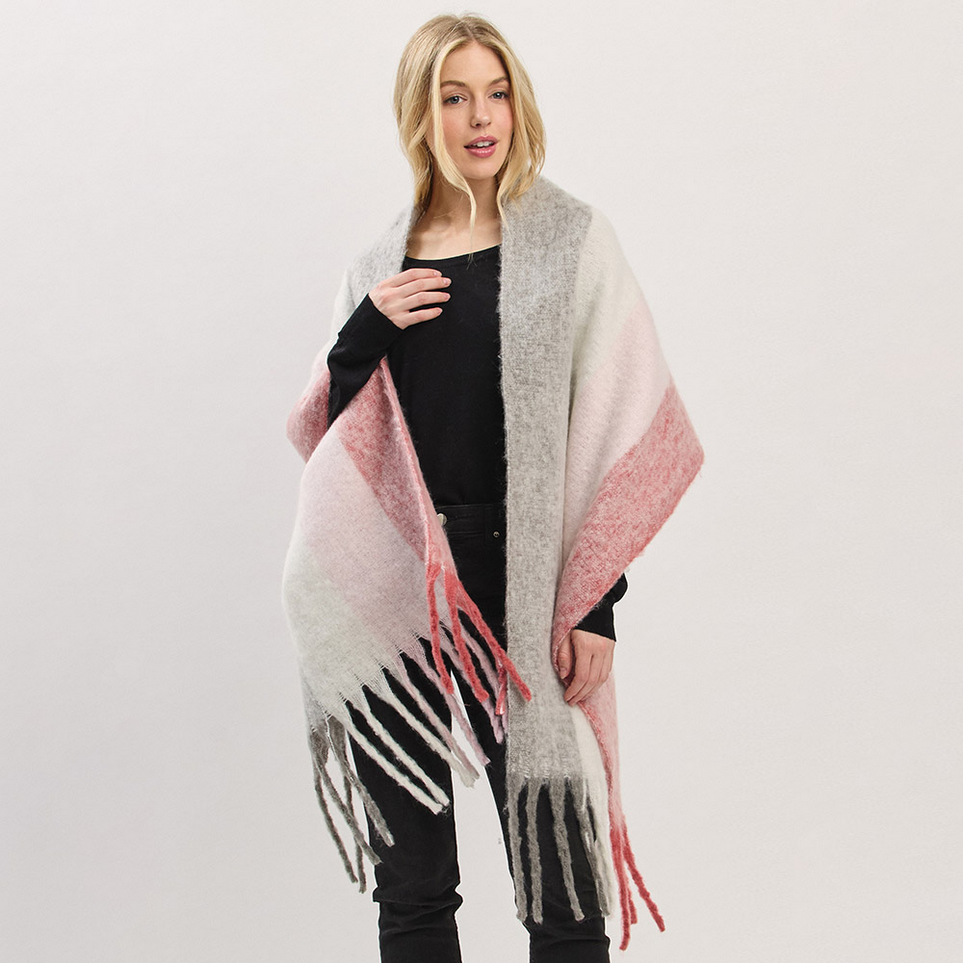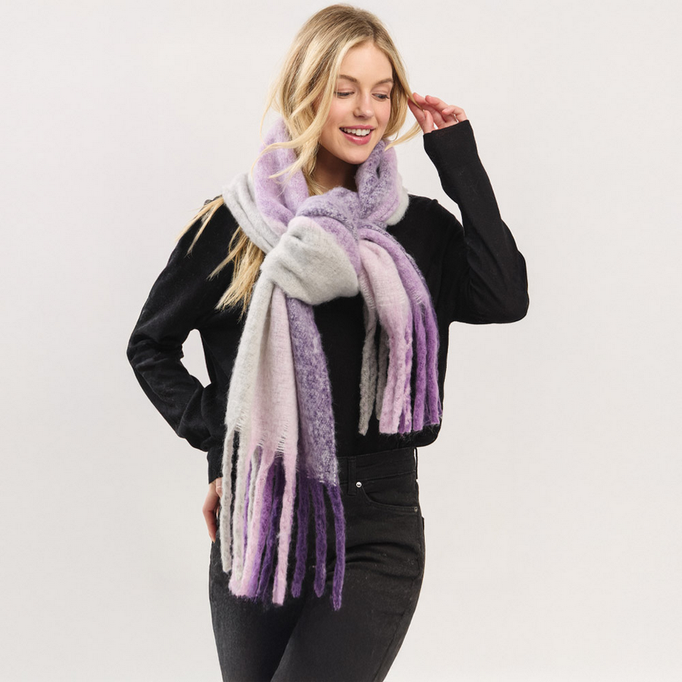 Wrap yourself in softness and style with our Oversized Colorblock Brushed Knit Fringe Scarf. Designed with wide blocks of beautifully blended colors, this ultra-soft statement piece is the perfect blend of warmth and fashion. Crafted from plush 100% polyester with a brushed finish, it drapes effortlessly over your shoulders or layers around your neck for added volume and texture. Generously sized and finished with long dramatic fringe, it’s a cold-weather essential you'll reach for all season long. Available in multiple colorways to suit your winter mood.