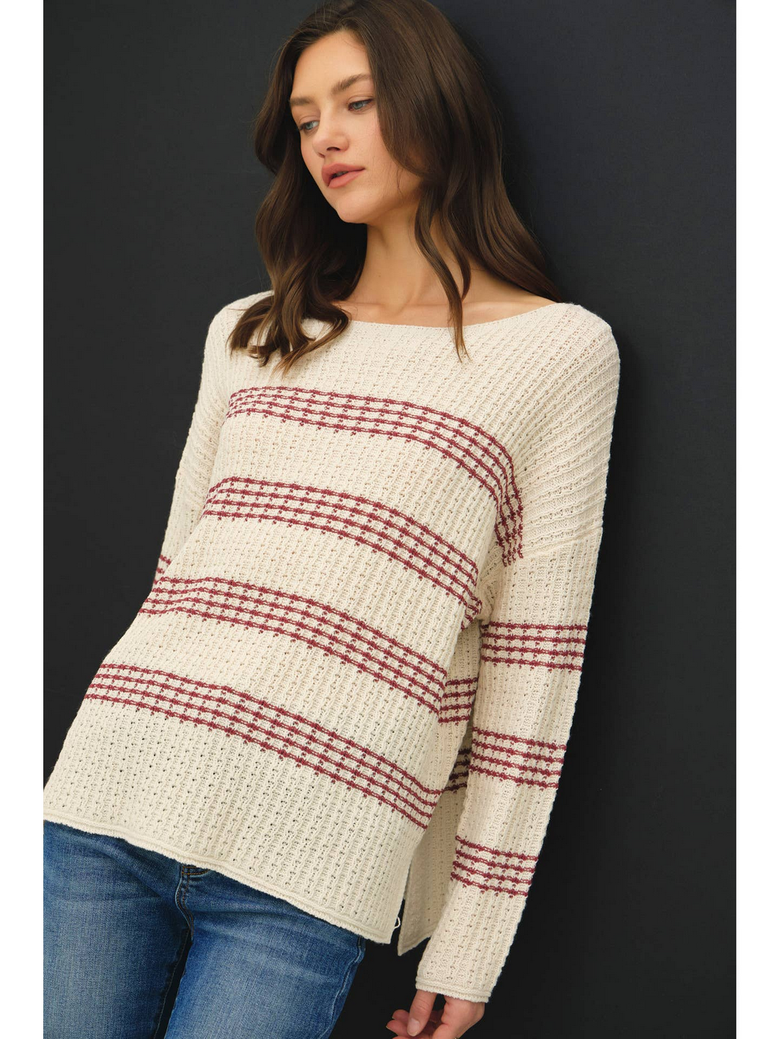 The horizontal stripe detail adds subtle interest, making it perfect for pairing with denim, trousers, or layering over dresses during transitional seasons. Comfortable, flattering, and endlessly versatile, it’s a cozy staple with just enough polish.