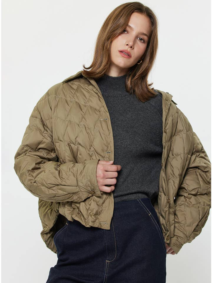 Cozy up in cool-weather style with this quilted crop jacket from Current Air. Designed with a boxy silhouette and subtle high-low hem, this piece blends modern structure with utilitarian warmth. The diamond quilting is filled with plush duck down insulation for lightweight yet effective comfort, while snap buttons and a foldover collar keep the look refined and functional. Perfect for layering over everything from sweaters to dresses, this olive-toned neutral easily transitions from weekday errands to weekend strolls.