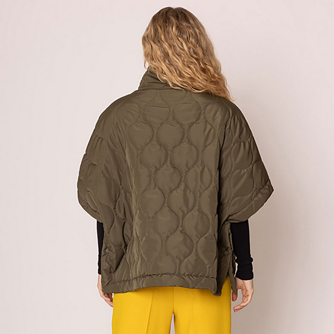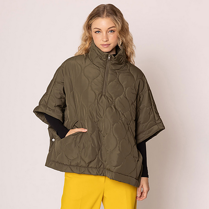 Create an accountWrap yourself in cozy sophistication with our Quilted Short Sleeve Puffer Pullover Poncho. Designed with a modern silhouette and easy pullover style, this piece blends the warmth of a puffer jacket with the effortless drape of a poncho. The quilted pattern adds visual texture, while the mock neck and short sleeves give it a fashion-forward feel. Featuring side snap closures and front kangaroo pockets for both style and function.