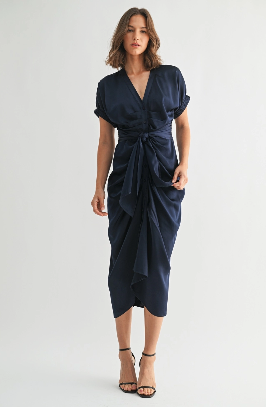 Featuring a flattering dolman sleeve, V-neckline, and draped front tie, this dress exudes soft structure and sophisticated charm. The gathered waist cinches in all the right places, creating a beautiful hourglass shape without sacrificing comfort. A graceful midi hemline and subtle front slit complete the look. From dinner parties to weddings, this versatile piece works for every fall occasion.