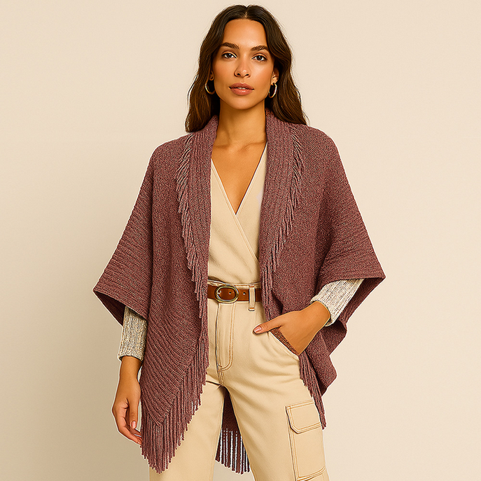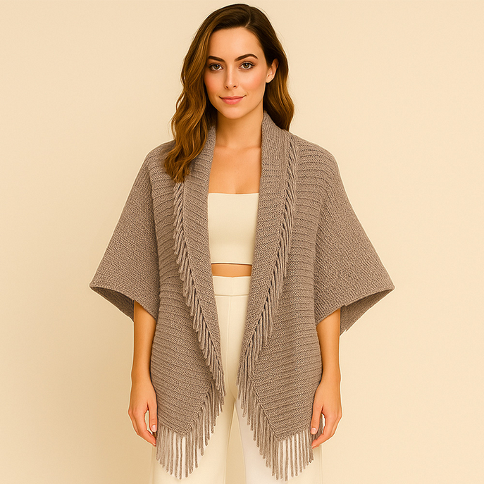 Create an accountWrap yourself in cozy elegance with our Solid Knit Fringe Trim Cocoon Shawl. Designed with a relaxed cocoon silhouette and finished with a dramatic fringe trim, this layering piece brings effortless polish to any cold-weather outfit. The soft, midweight acrylic knit provides warmth without bulk, making it perfect for transitioning seasons or chilly indoor spaces. With an open front and roomy fit, it’s a one-size-wonder that flatters all body types. Available in a variety of versatile colors to complement your wardrobe.