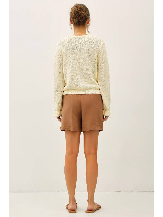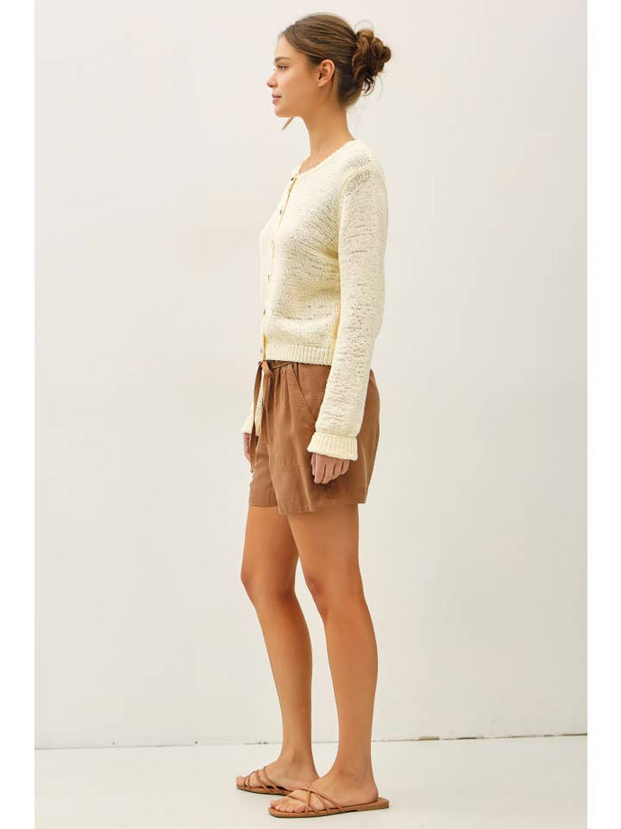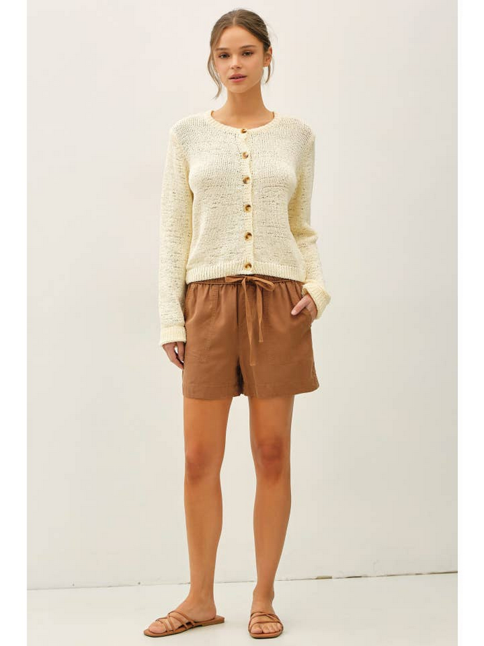 The slubbed knit texture adds subtle dimension, while the slightly relaxed fit keeps it comfortable and easy to wear. Finished with button front closure and volume cuffs, this cardigan has just enough detail to feel elevated without being overdone.